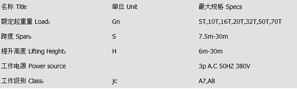 注:Gn=額定起重噸位 S=跨度(左軌道至右軌道的距離) H=提升高度(地面至吊鉤高點(diǎn)的距離)